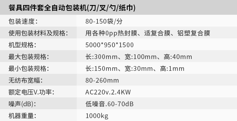1、本機適用于餐具四件套的自動下料和包裝,可自動完成生產(chǎn)日期的打印。